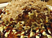 Japanese pancake made with wheat flour, eggs, seafood mix, fish cakes and veggies. Topped with noodle, okonomiyaki sauce, mayo and bonito flakes
